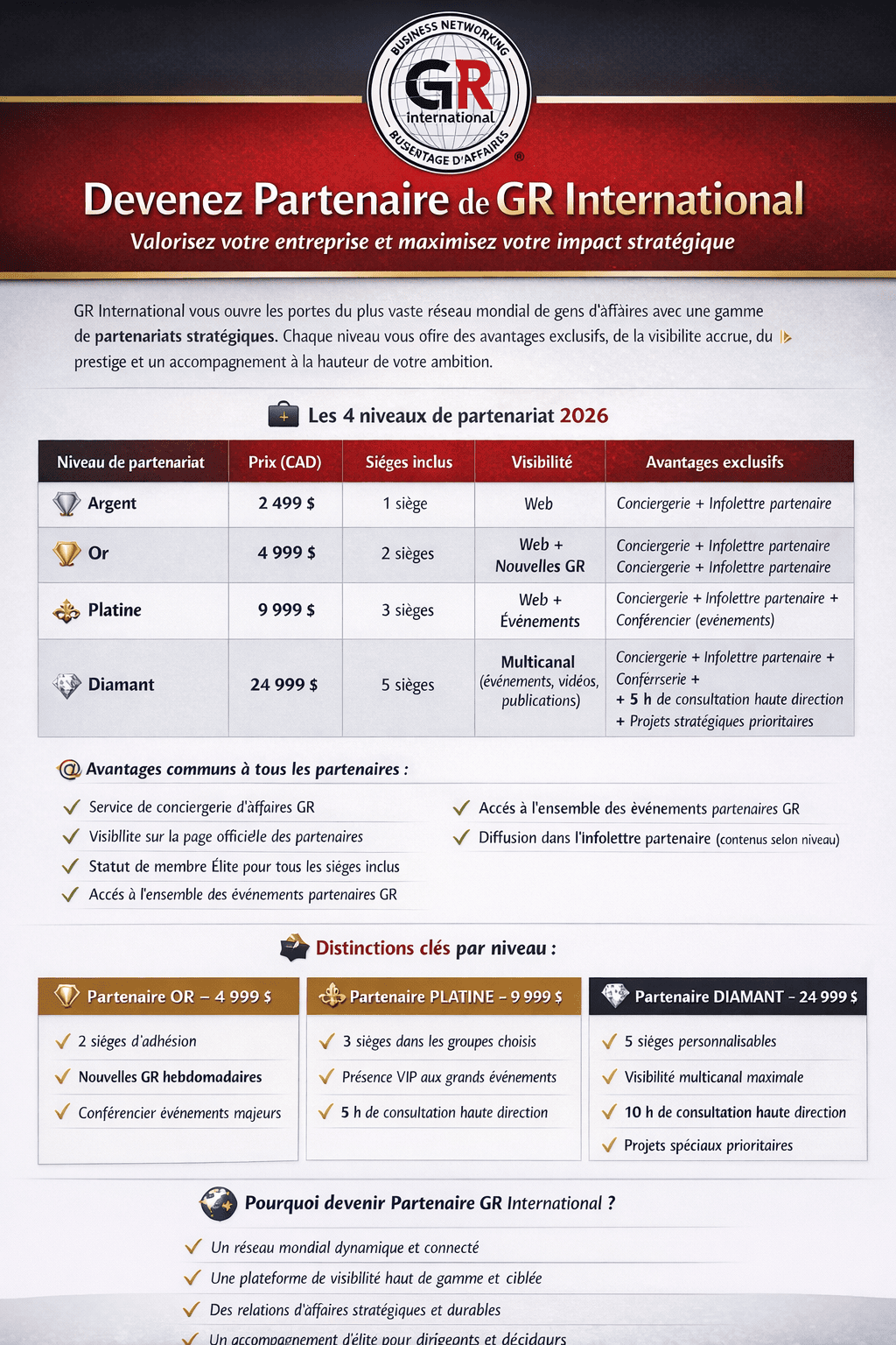 - GR International recevra un crédit équivalent à 10% qui sera appliqué sur son bureau d’une valeur de 2500$ dans la suite GR à Brossard;